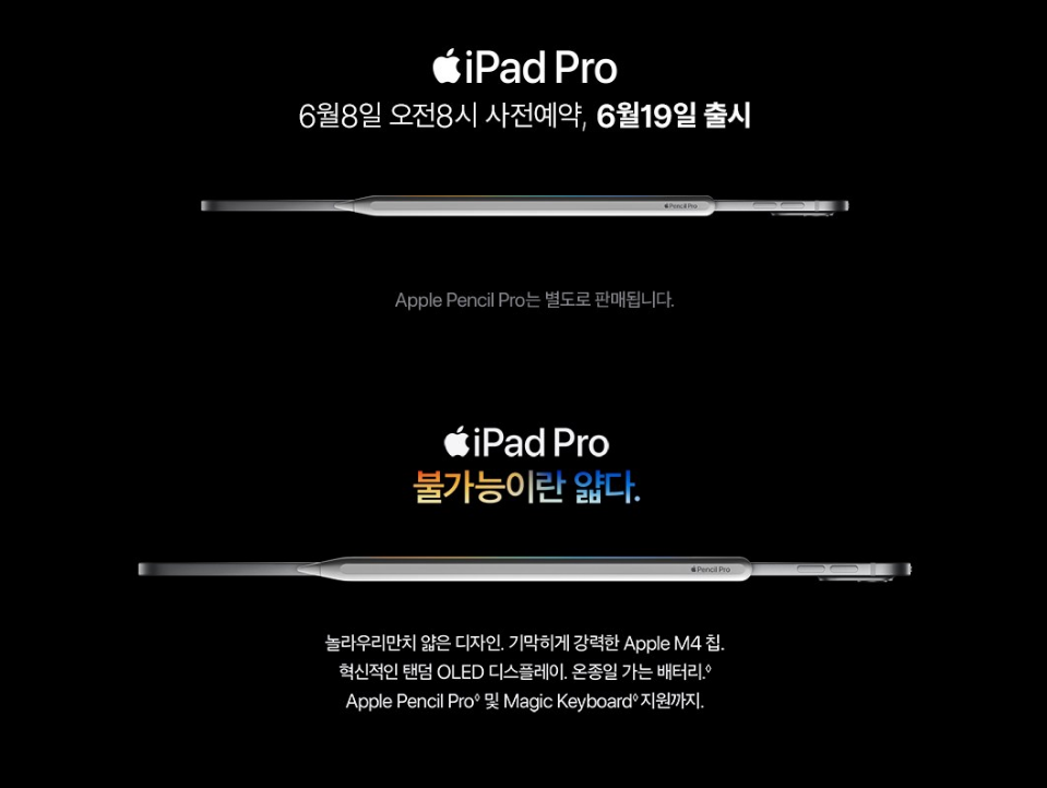 아이패드 프로7세대 사전예약이 2024년 6월 8일 오전 08시에 시작 되었습니다.