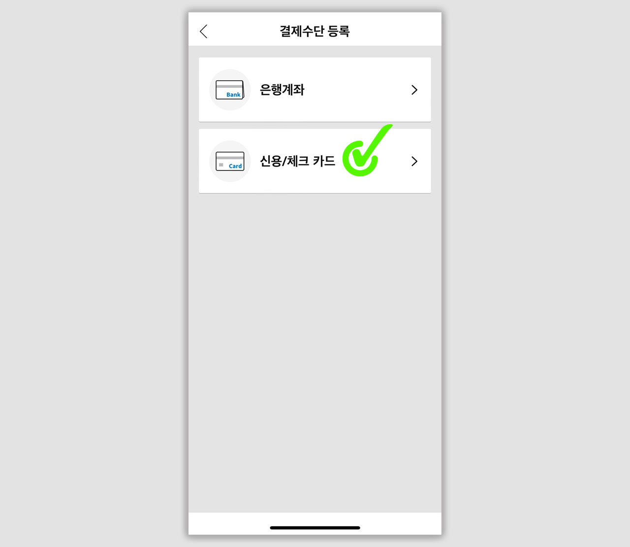 ⑤ 신용/체크 카드 탭을 눌러 준비된 할인카드를 등록 해준다.
