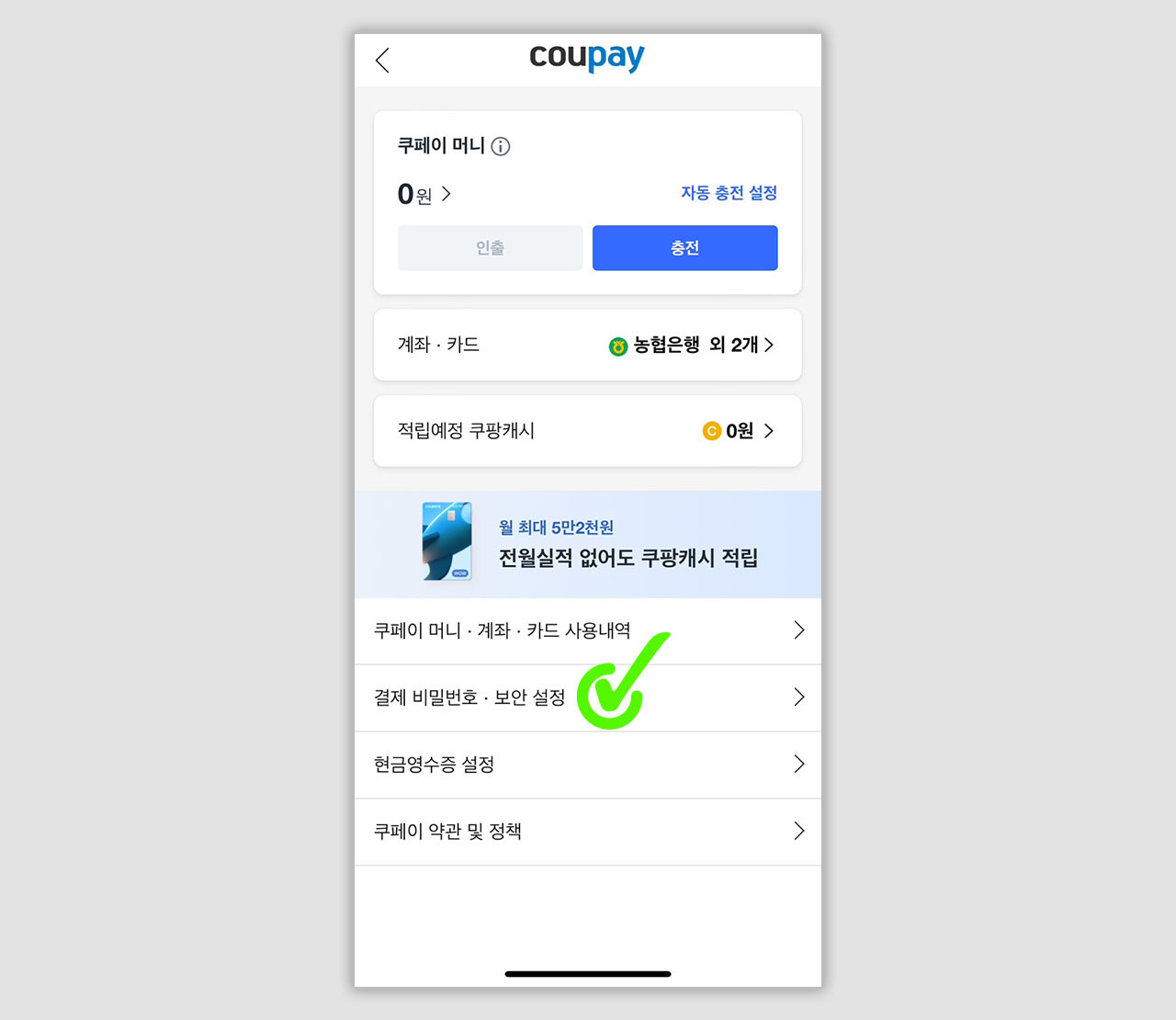 ③ 결제수단·쿠페이에서 결제 비빌먼호 / 보안설정 클릭합니다