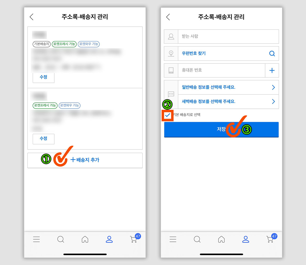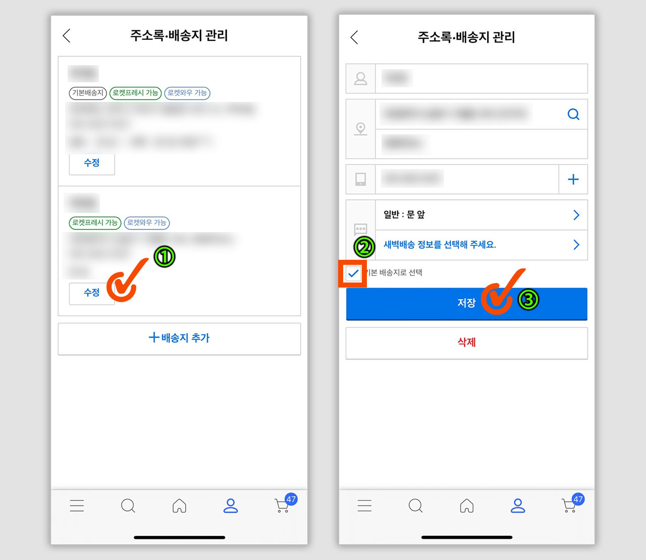 이미 기본 배송지가 받을 곳으로 잘 입력 되었다면, 수정할 필요는 없습니다.