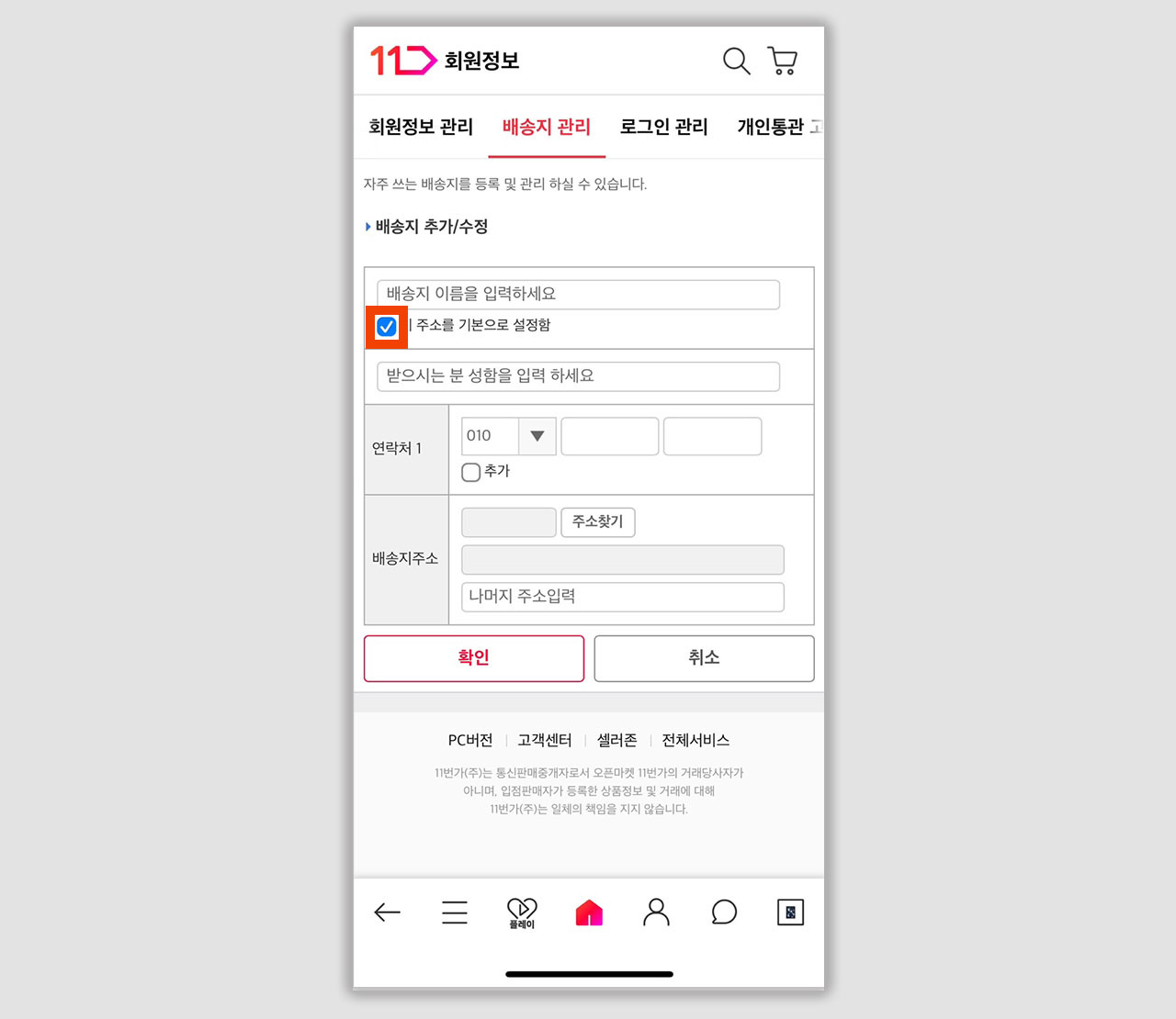 ⑤ 기본 배송지를 입력 해주시고, "이 주소를 기본으로 설정함" 체크박스를 체크 해주세요!