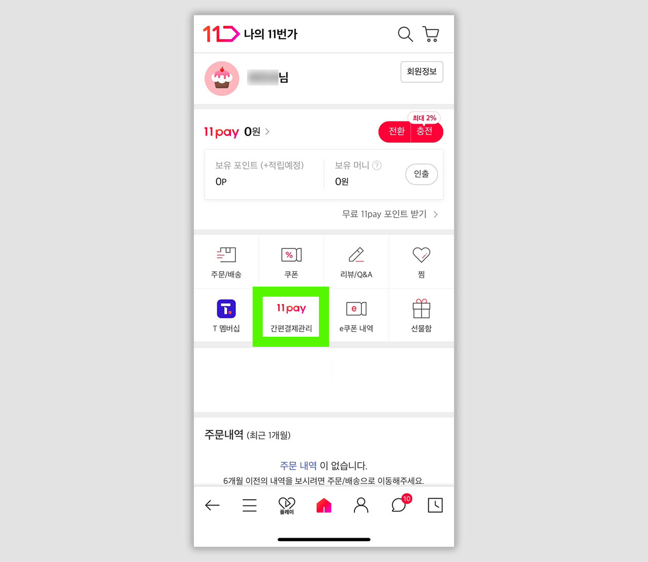 ① 11번가 앱 하단에 사람모양의 마이페이지를 터치 해줍니다.