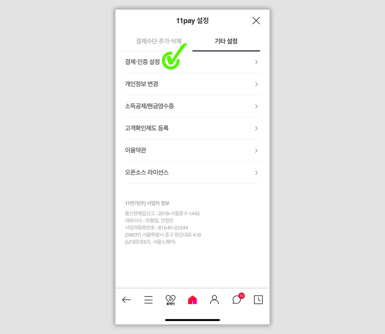 ④ 기타 설정 탭에서 맨상단의 "결제·인증 설정" 탭을 터치해줍니다.