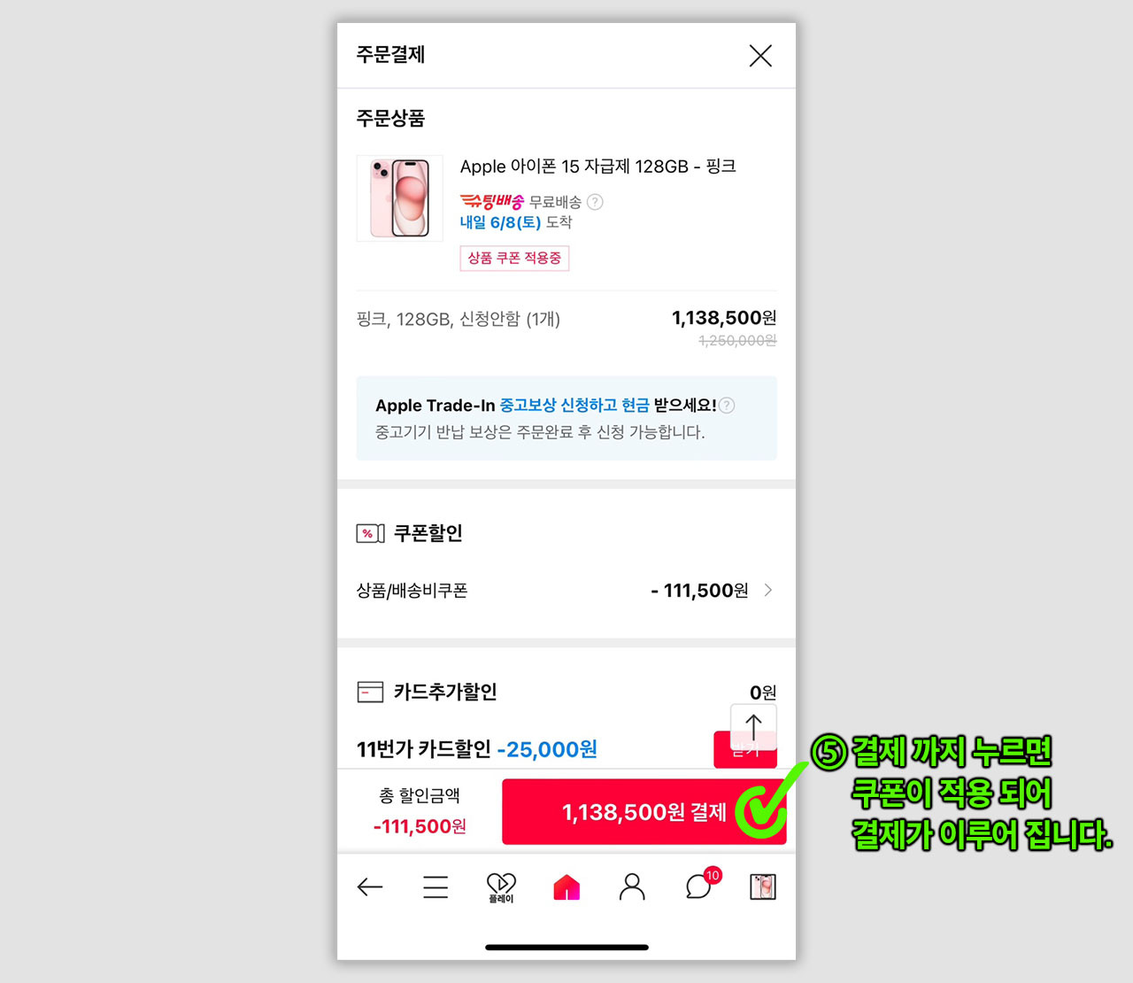 결제 까지 누르면 쿠폰이 적용되어 결제가 이루어 집니다.