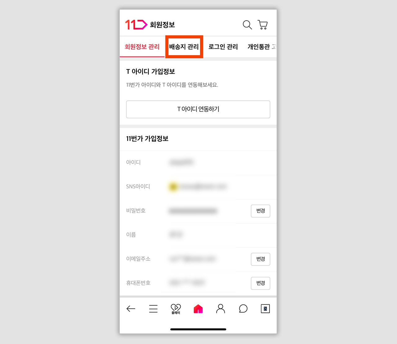 ③ 회원정보 탭에서 두번째 "배송지 관리" 탭을 터치해주세요