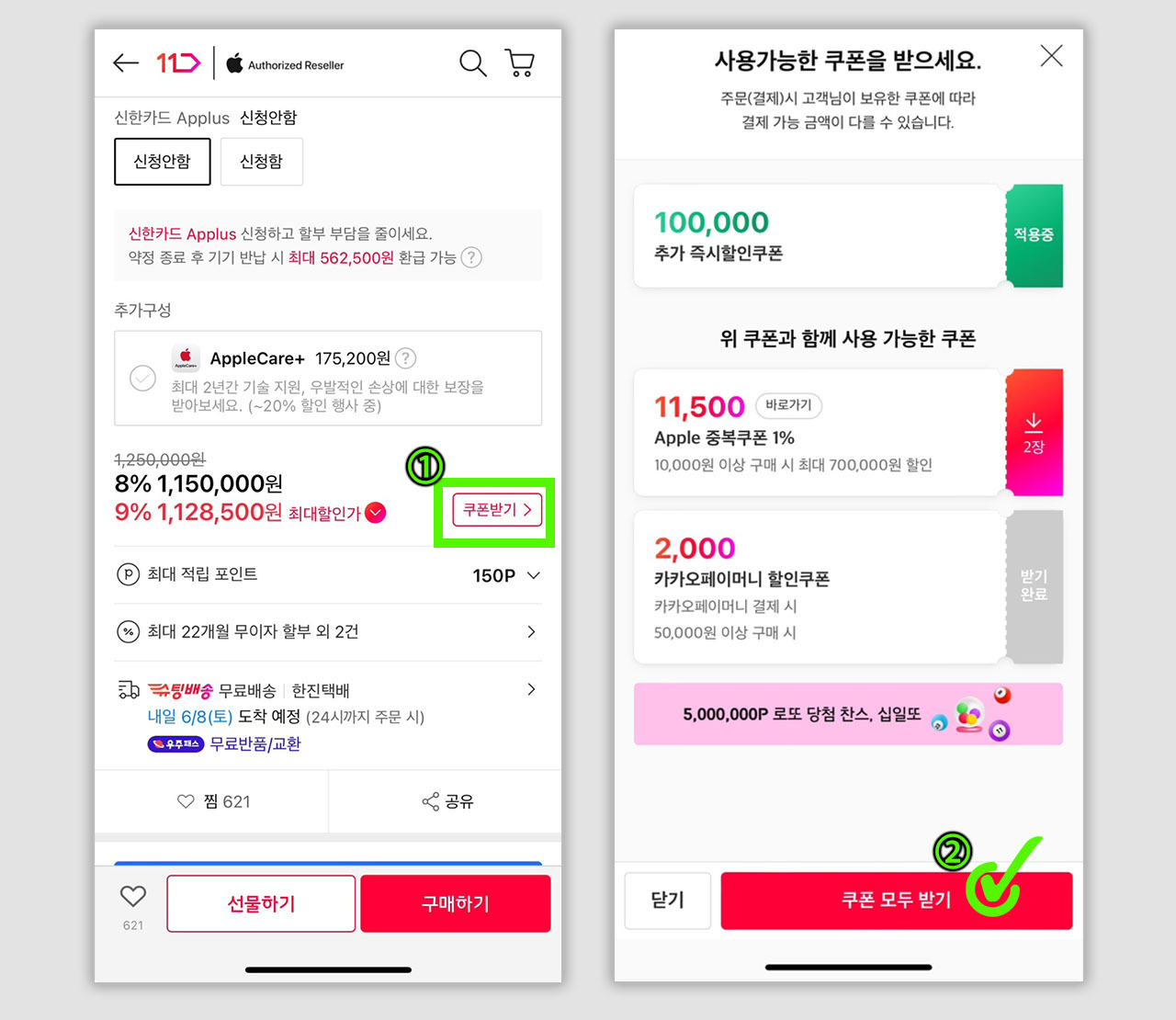 아이패드 "구매하기" 버튼이 활성화 되면 "쿠폰받기" 를 클릭하여