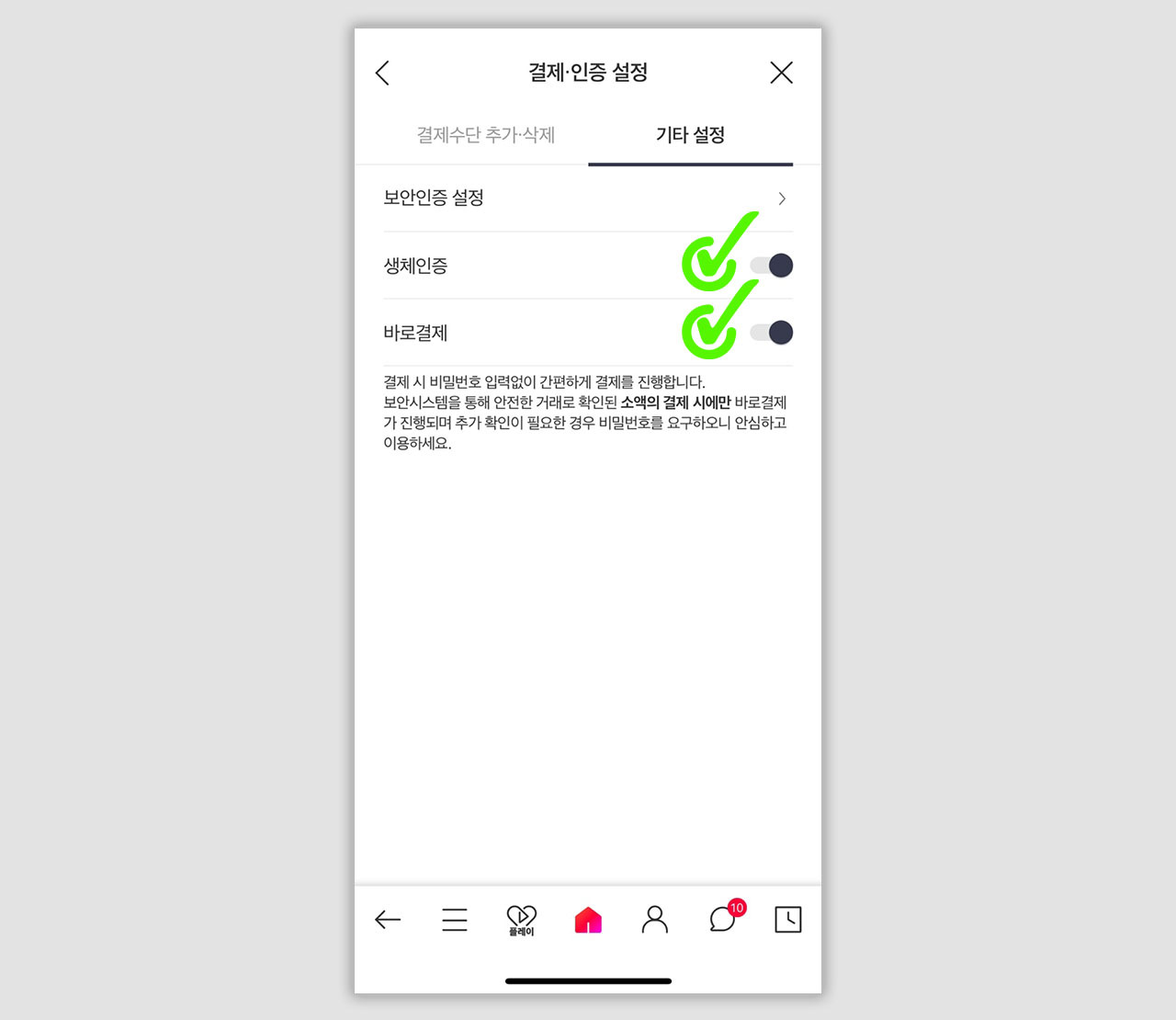 ⑤ 결제·인증 설정에서 생체인증, 바로결제를 활성화 해주세요