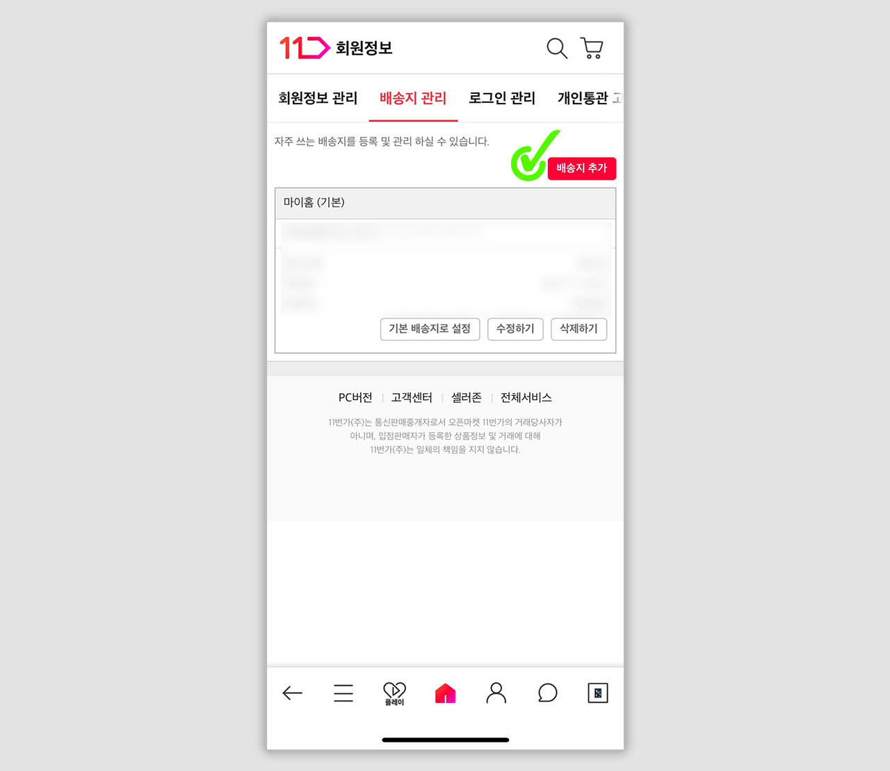 ④ "배송지 관리" 탭에서 바로 아래 배송지 추가 버튼을 터치해주세요